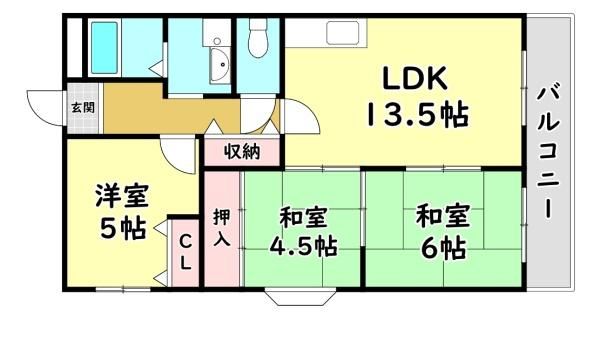| 間取り詳細 | LDK13.5畳、洋5畳、和4.5畳、和6畳 | 保証会社 | 加入要 保証料:月額賃料等の50% |